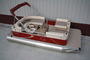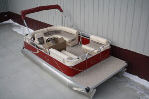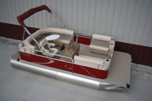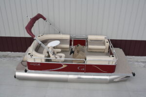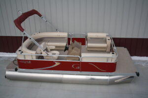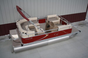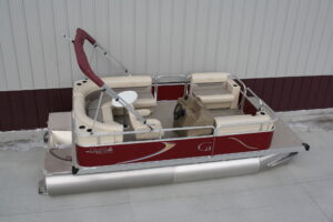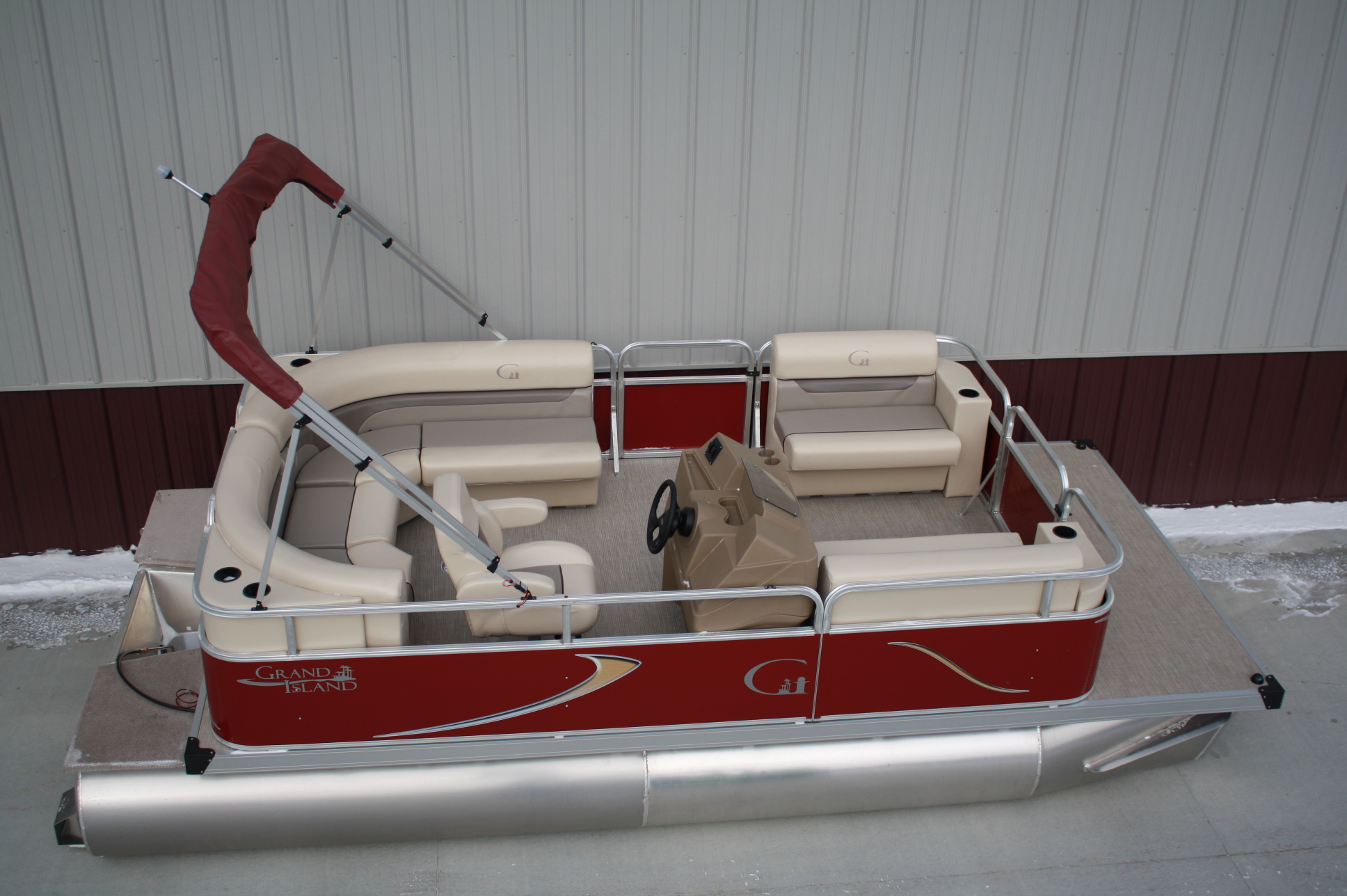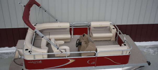 18 ft. Grand Island G series Cruise pontoon with a 25 hp. 4 stroke and a single axle bunk trailer. Boat will be rigged after the sale. This is a new pontoon, but a scratch and dent model so it may be a little dirty and may have minor cosmetic blemishes, but again, it is brand new so nothing to affect warranty or performance. It comes with a wraparound L bench, captain’s seat, two front benches, woven vinyl flooring, table, console, two doors, bimini top, navigation lights, windshield, 23 inch floats, front swim deck, etc. The engine is a new 25 hp. Tohatsu 4 stroke, three cylinder, with power tilt, electric start, and EFI. This engine comes with a full 5-year warranty. The trailer is a new 17 ft. single axle bunk style trailer by Grand Island with guide posts, winch stand steps, 2500# axle with greasable hubs, full length bunks and a tongue jack. This is a very comfortable little cruising pontoon with plenty of legroom, lots of comfortable seating and great value. This is just one of almost 500 pontoon boats available at T & M Marine in Grand Rapids / Cohasset MN. Feel free to call our non-commissioned sales people at 218-326-4223 as we would love to put our over 40 years’ experience in the pontoon business to work for you. We will beat any price on a comparable pontoon in the entire USA. We ship worldwide and will have the lowest prices on pontoons you can find anywhere!!!