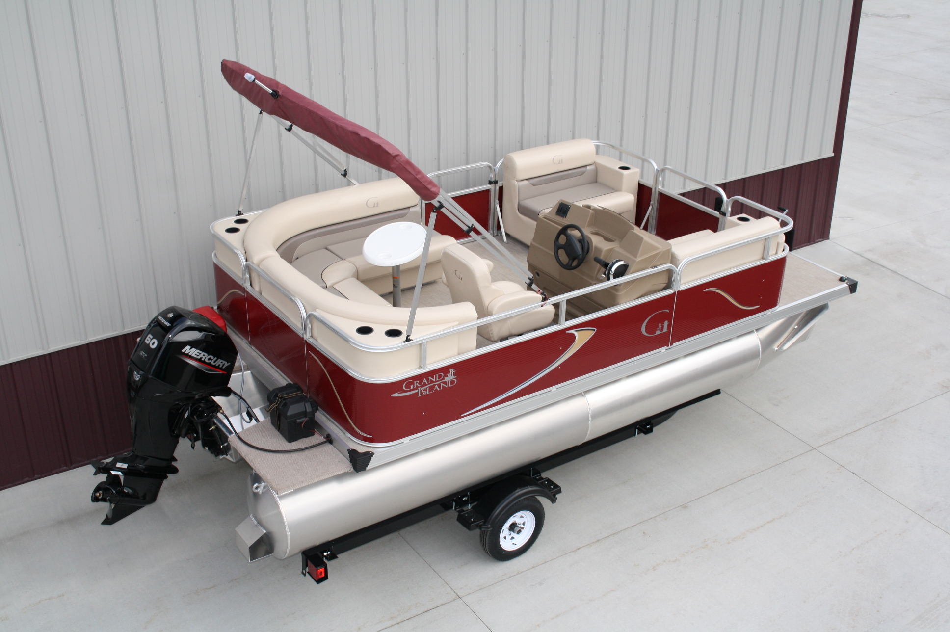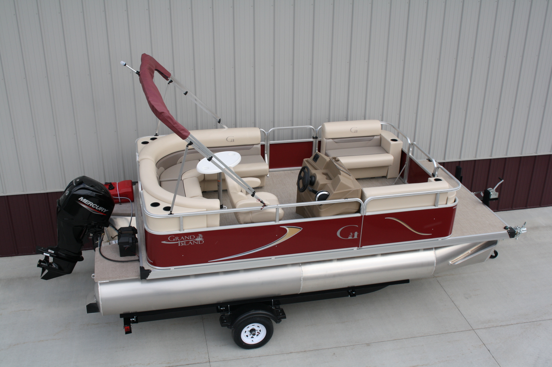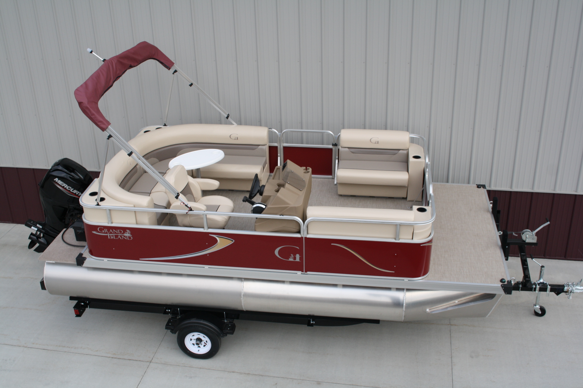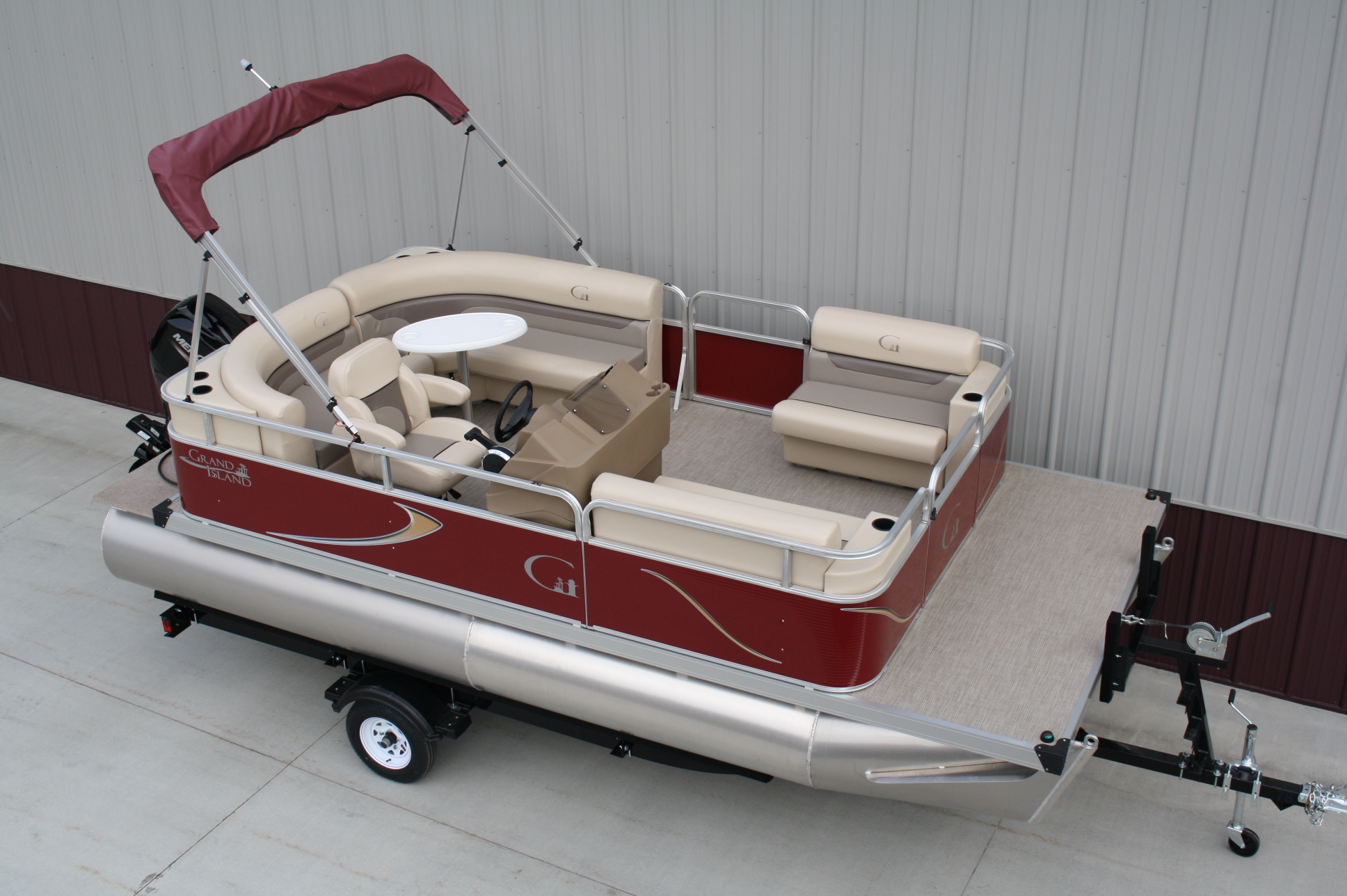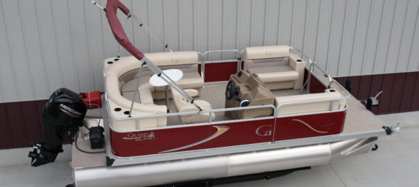 18 ft. Grand Island G series Cruise pontoon with a 60 hp. 4 stroke and a single axle bunk trailer.  This is a new pontoon, but a scratch and dent model so it may be a little dirty and may have minor cosmetic blemishes, but again, it is brand new so nothing to affect warranty or performance.  It comes with a wraparound L bench, captain’s seat, two front benches, woven vinyl flooring, table, console, two doors, bimini top, navigation lights, windshield, 23 inch floats, front swim deck, etc.  The engine is a new 60 hp. Mercury 4 stroke, with power tilt, electric start, and EFI.  This engine comes with a full 3-year warranty.  The trailer is a new 17 ft. single axle bunk style trailer by Grand Island with guide posts, winch stand steps, 2500# axle with greaseable hubs, full length bunks and a tongue jack.  This is a very comfortable little cruising pontoon with plenty of leg room, lots of comfortable seating, great speed and performance.  Only at T & M Marine can you get a complete pontoon package with an engine this large for under $24K.  This is just one of almost 500 pontoon boats available at T & M Marine in Grand Rapids / Cohasset MN.  Feel free to call our non-commissioned sales people at 218-326-4223 as we would love to put our over 40 years’ experience in the pontoon business to work for you.  We will beat any price on a comparable pontoon in the entire USA.  We ship world wide and will have the lowest prices on pontoons you can find anywhere!!!