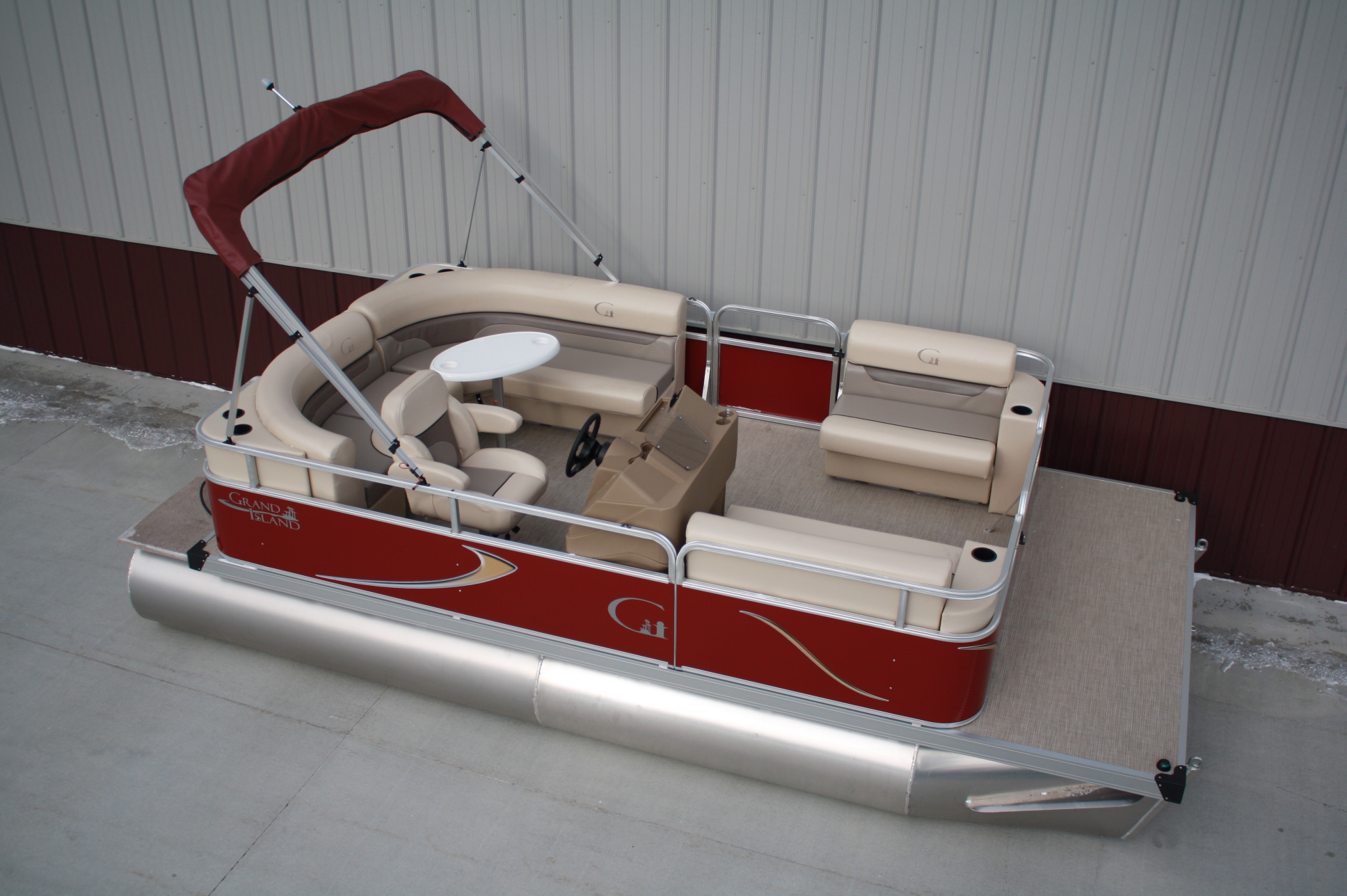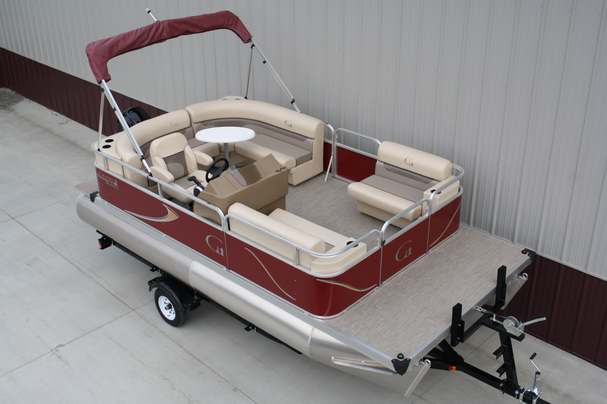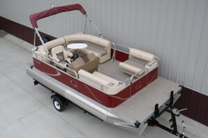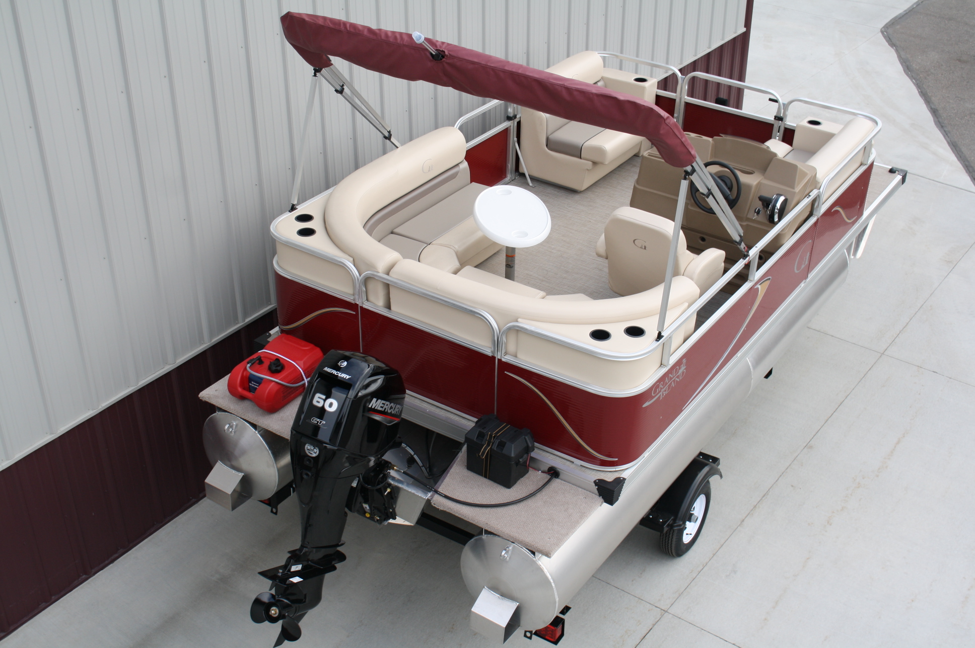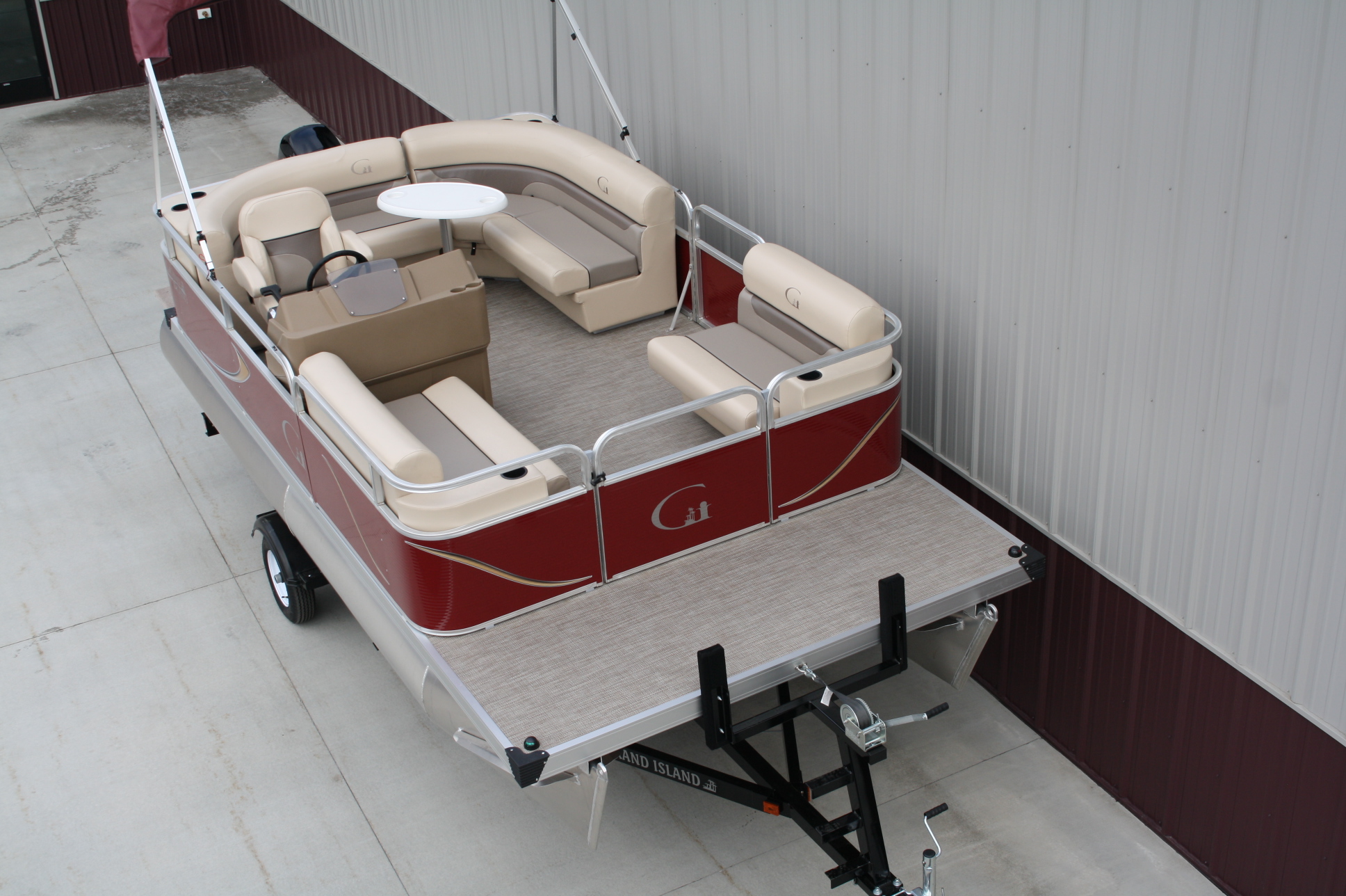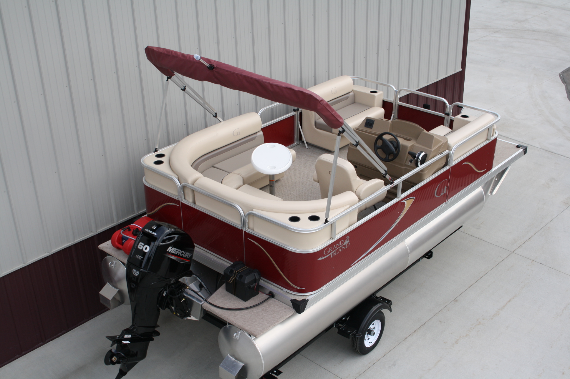 18 ft. Grand Island G series Cruise pontoon with a 60 hp. 4 stroke and a single axle bunk trailer.  This is a new pontoon, but a scratch and dent model so it may be a little dirty and may have minor cosmetic blemishes, but again, it is brand new so nothing to affect warranty or performance.  It comes with a wraparound L bench, captain’s seat, two front benches, woven vinyl flooring, table, console, two doors, bimini top, navigation lights, windshield, 23 inch floats, front swim deck, etc.  The engine is a new 60 hp. Mercury 4 stroke, with power tilt, electric start, and EFI.  This engine comes with a full 3-year warranty.  The trailer is a new 17 ft. single axle bunk style trailer by Grand Island with guide posts, winch stand steps, 2500# axle with greaseable hubs, full length bunks and a tongue jack.  This is a very comfortable little cruising pontoon with plenty of leg room, lots of comfortable seating, great speed and performance.  Only at T & M Marine can you get a complete pontoon package with an engine this large for under $24K.  This is just one of almost 500 pontoon boats available at T & M Marine in Grand Rapids / Cohasset MN.  Feel free to call our non-commissioned sales people at 218-326-4223 as we would love to put our over 40 years’ experience in the pontoon business to work for you.  We will beat any price on a comparable pontoon in the entire USA.  We ship world wide and will have the lowest prices on pontoons you can find anywhere!!!
