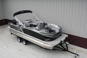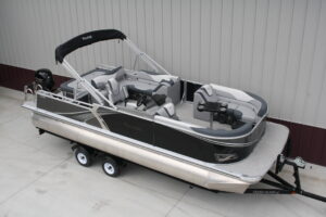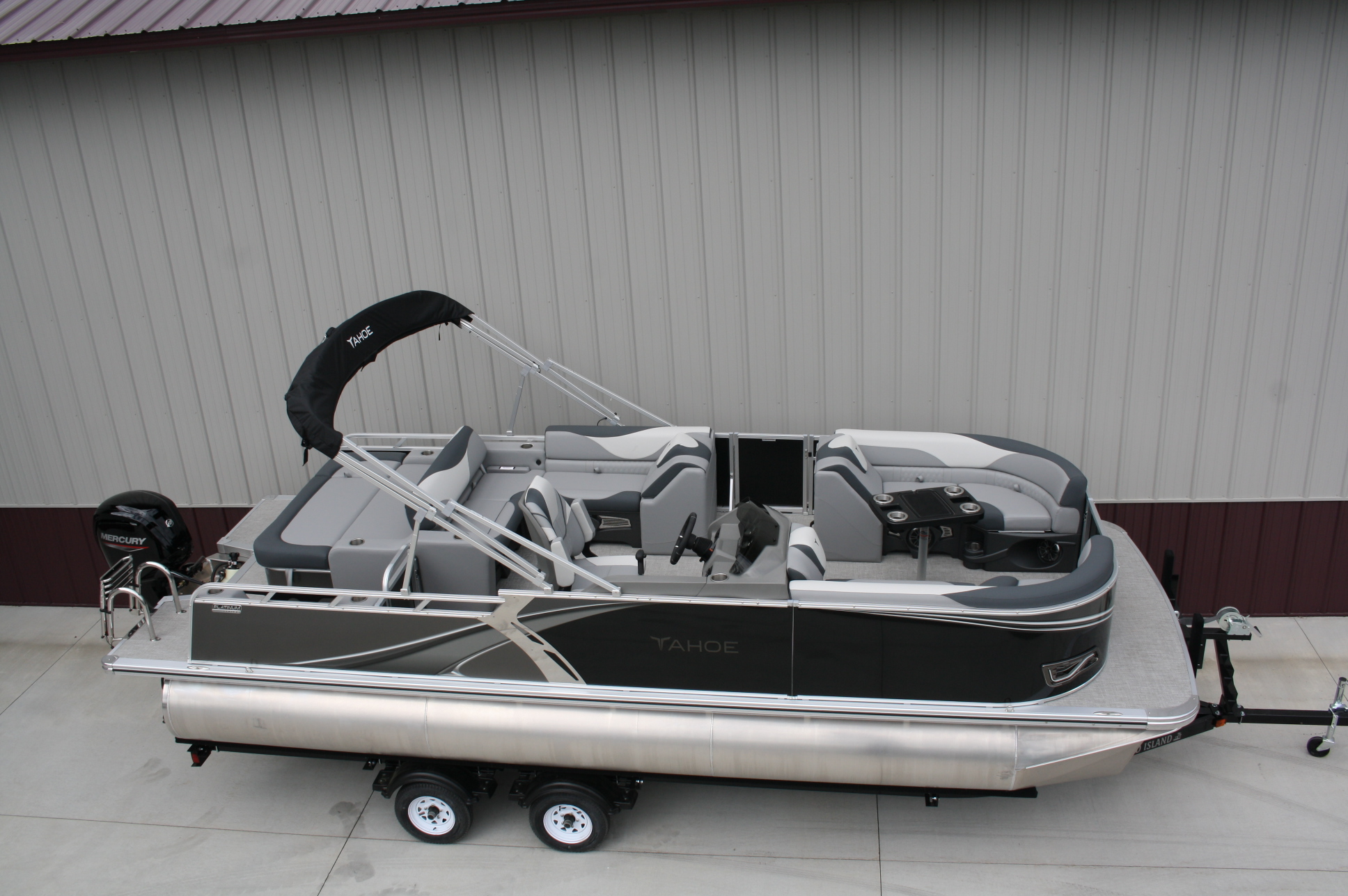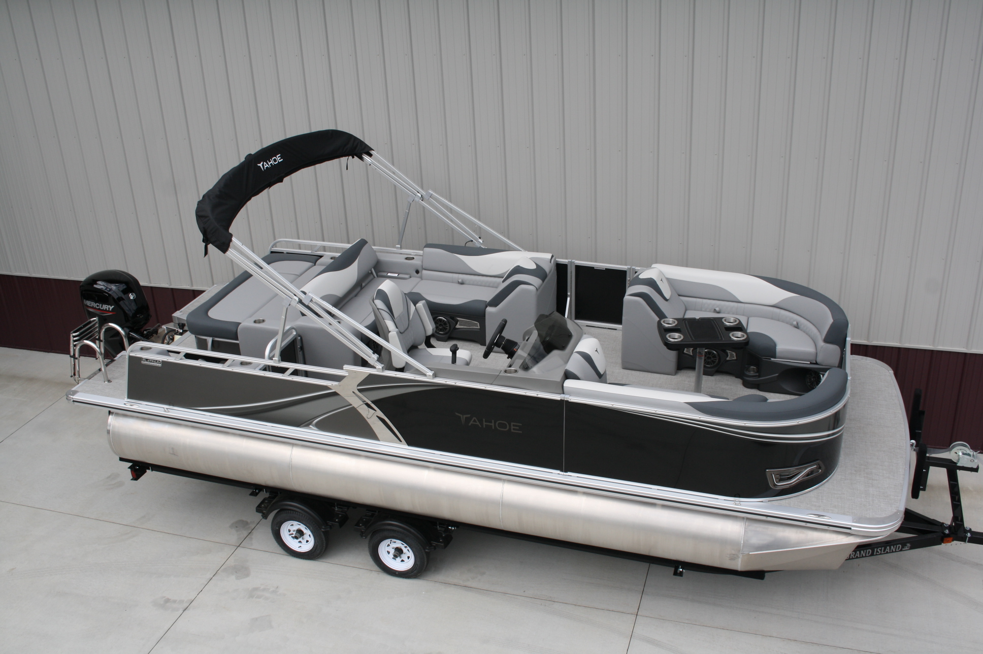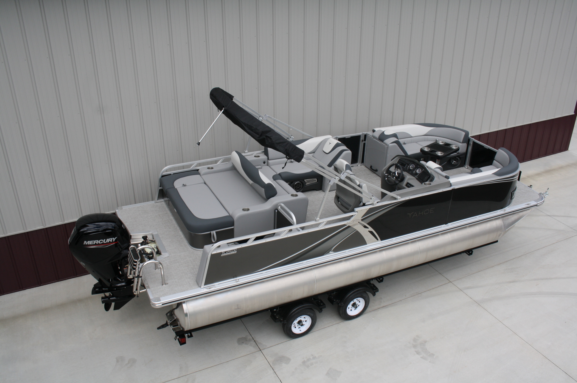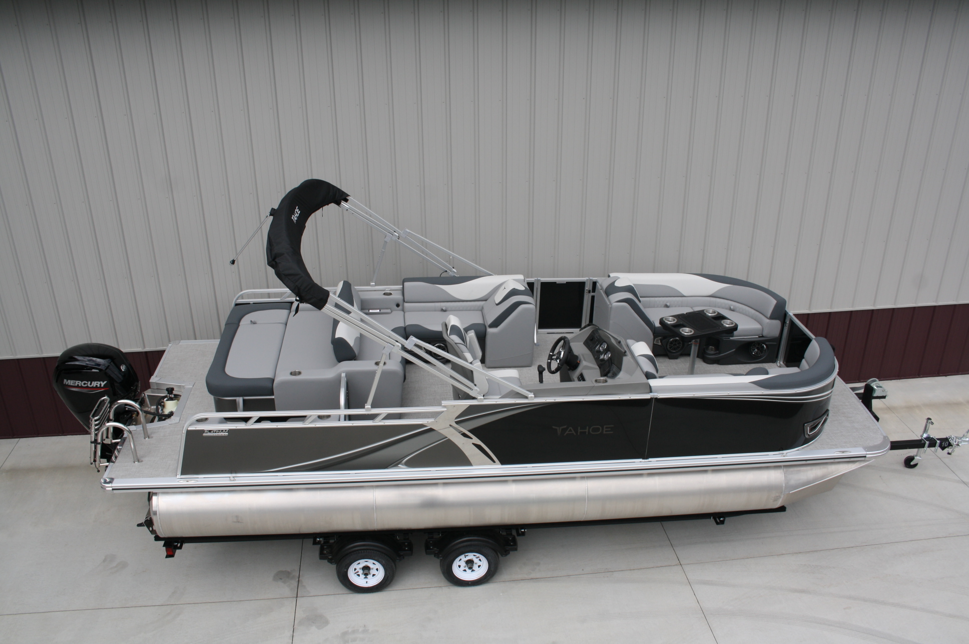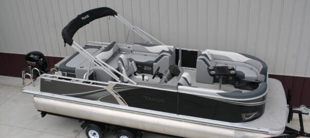 Tahoe 2385 LTZ Versatile Rear Bench Platinum edition twin tube pontoon with a 115 hp. Mercury and a dual axle bunk trailer. This is a well put together package, especially for the price. It has two 25 inch floats, bottom keels, 25 gal. gas tank, 10 ft. bimini top, rear swim deck, woven vinyl flooring, 50 ounce UV resistant vinyl, aluminum seat frames, graphite interior, rear sun deck lounge / swing back rear seat back with large bed, premium table, full snap cover, reclining captain’s seat, LED docking lights, interior light, exterior mood lights, nav. lights, blue tooth stereo with four speakers, gauges, 12 volt power source, USB charging ports, stainless steel rear ladder, bottom keels, chase lounge seating, stainless steel cup holders, windshield, etc. The engine is a new 115 hp. Mercury 4 stroke EFI and is water ready. The trailer is a new 24 ft. dual axle bunk style with greaseable hubs, 2500# axles, steps on front, guide posts, full length bunks and a tongue jack. This boat has modern styling and an appearance portraying a value of twice its cost. This layout is the new craze in pontoons. It converts to a rear facing lounge, front facing lounge and a full lay down sunning bed. Shipping $2 per loaded mile and overseas shipping is available. NO DEALER FEES!! Come visit our new showroom in Grand Rapids/Cohasset MN or give us a call at 218 three two six 4223. We have over 400 pontoons in stock and will be any price in the USA!