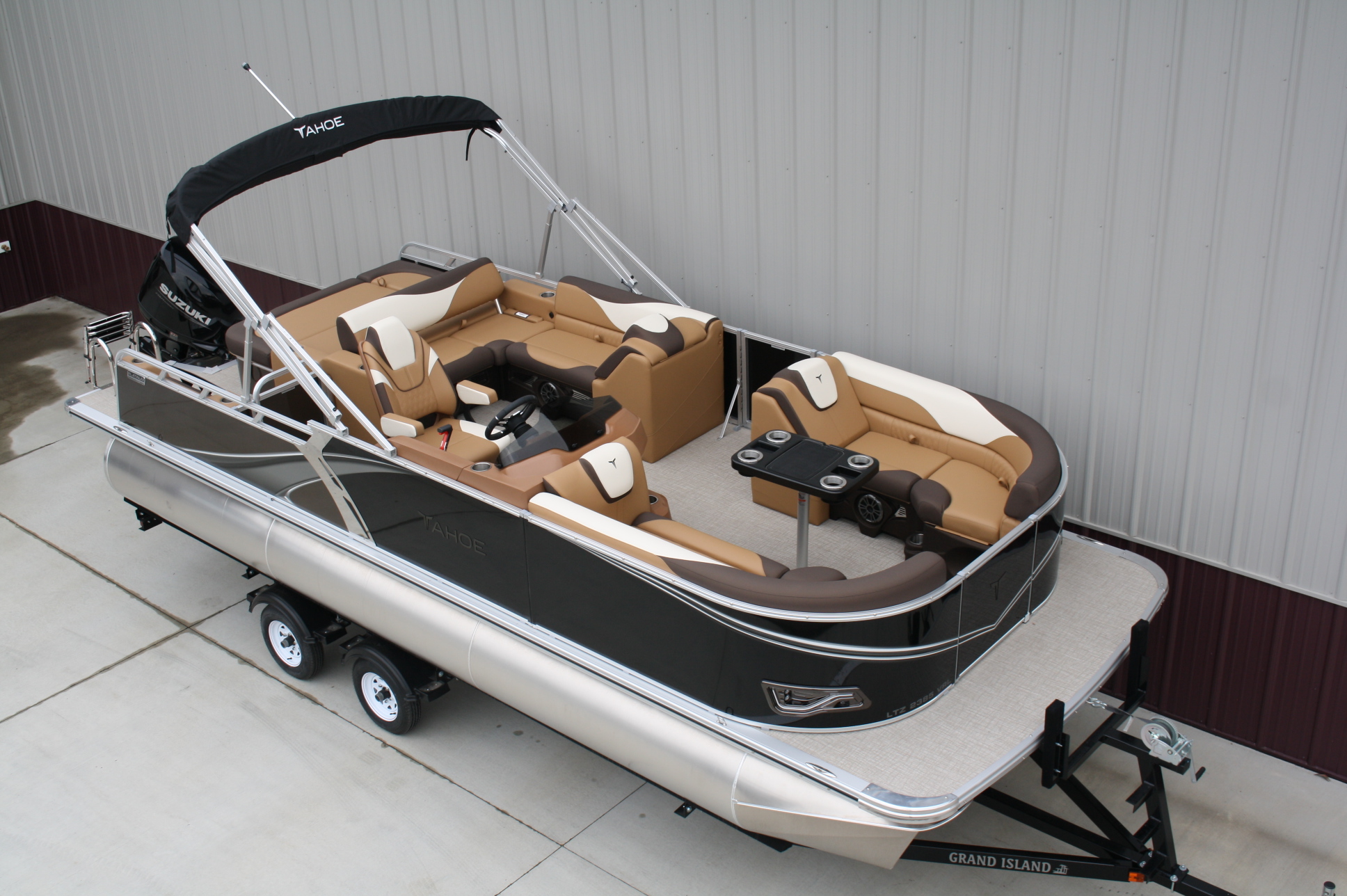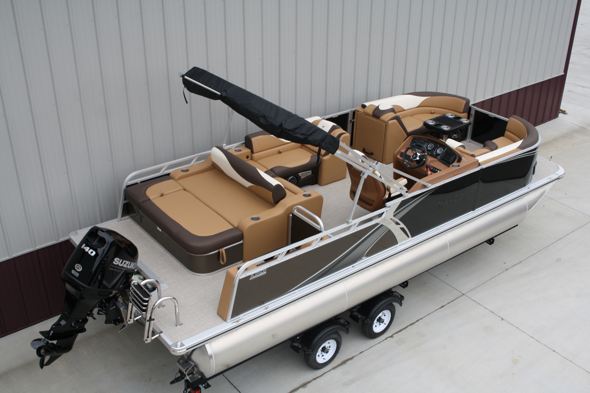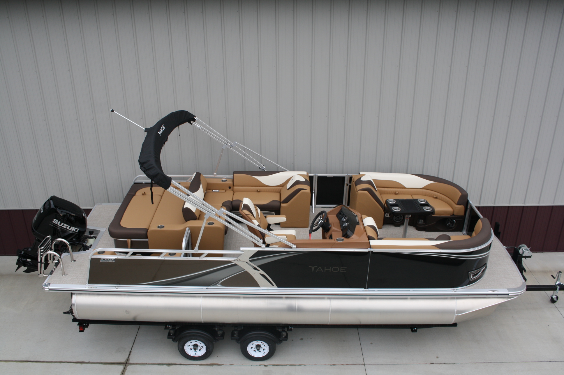 Tahoe 2385 LTZ Versatile Rear Bench Platinum edition twin tube pontoon with a 140 hp. Suzuki and a dual axle bunk trailer. This is a well put together package, especially for the price. It has two 25 inch floats, bottom keels, 25 gal. gas tank, 10 ft. bimini top, rear swim deck, woven vinyl flooring, 50 ounce UV resistant vinyl, aluminum seat frames, cognac interior, rear sun deck lounge / swing back rear seat back with large bed, premium table, full snap cover, reclining captain’s seat, LED docking lights, interior lights, exterior mood lights, nav. lights, blue tooth stereo with four speakers, gauges, 12 volt power source, USB charging ports, stainless steel rear ladder, bottom keels, chase lounge seating, stainless steel cup holders, windshield, etc. The engine is a new 140 hp. Suzuki 4 stroke EFI and is water ready. A five year engine warranty is included. The trailer is a new 24 ft. dual axle bunk style with greaseable hubs, 2500# axles, steps on front, guide posts, full length bunks and a tongue jack. This boat has modern styling and an appearance portraying a value of twice its cost. This layout is the new craze in pontoons. It converts to a rear facing lounge, front facing lounge and a full lay down sunning bed. Shipping $2 per loaded mile and overseas shipping is available. NO DEALER FEES!! Come visit our new showroom in Grand Rapids/Cohasset MN or give us a call at 218-326-4223. We have over 400 pontoons in stock and will be any price in the USA!