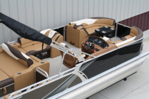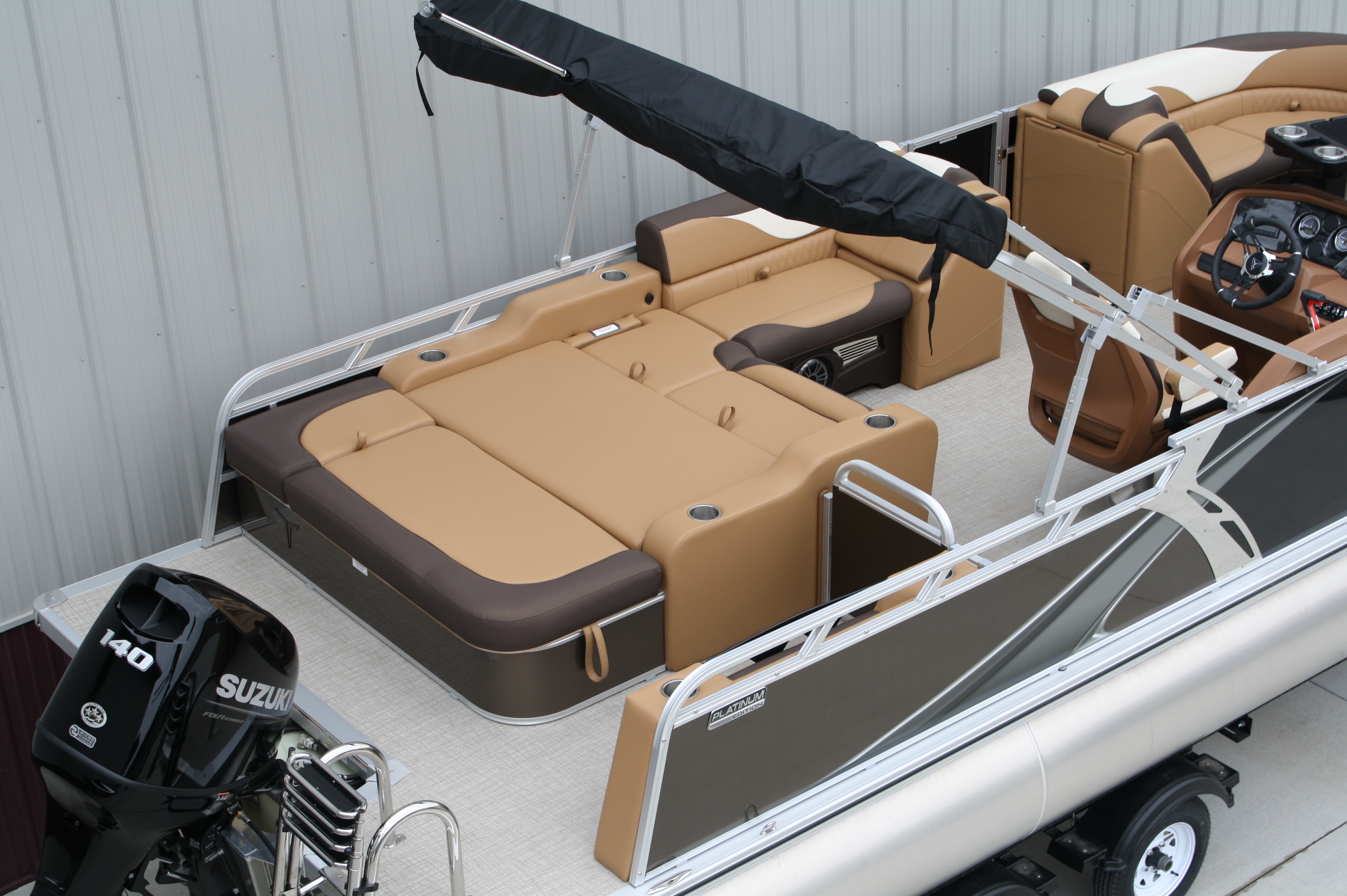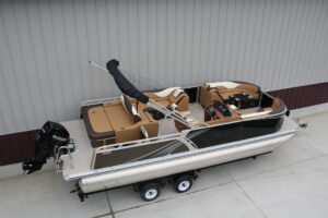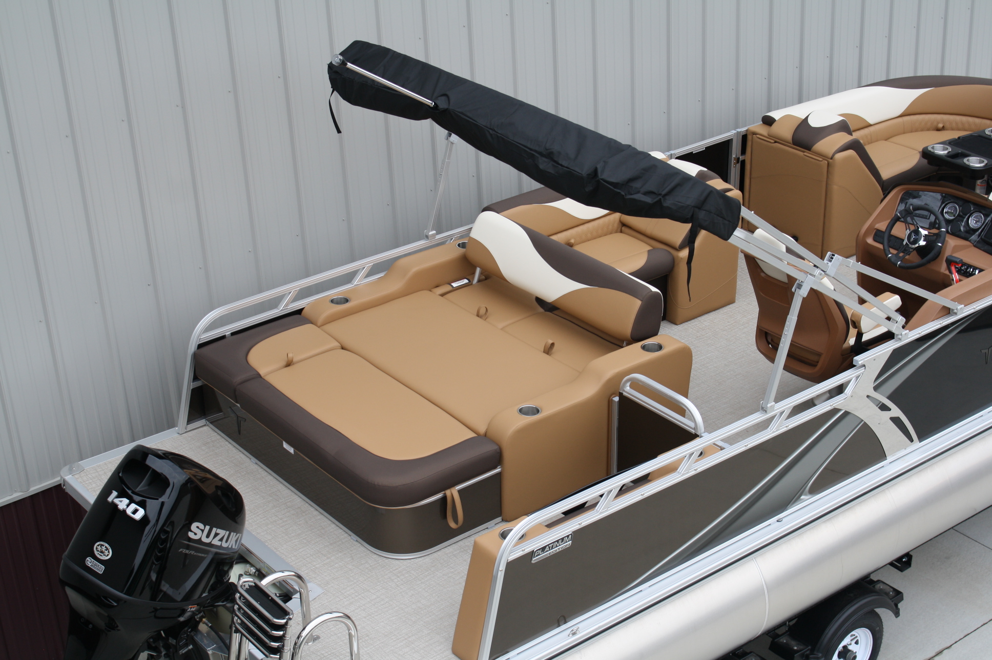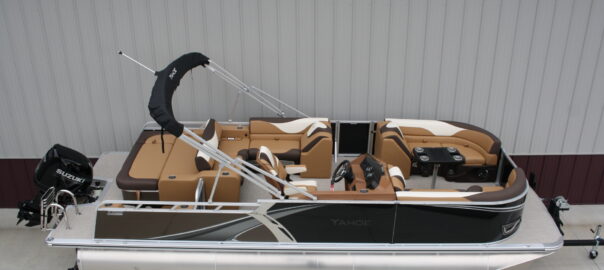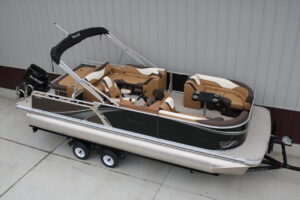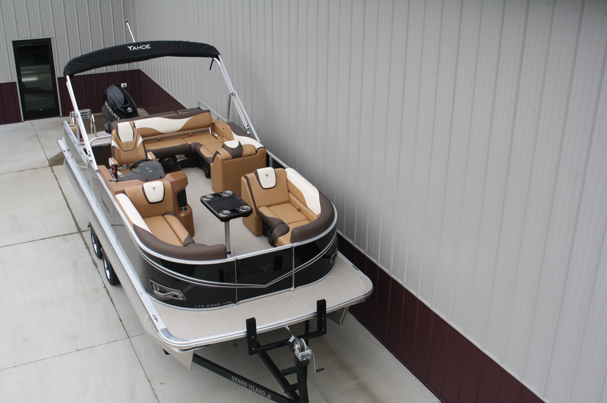 Tahoe 2385 LTZ Versatile Rear Bench Platinum edition twin tube pontoon with a 140 hp. Suzuki and a dual axle bunk trailer. This is a well put together package, especially for the price. It has two 25 inch floats, bottom keels, 25 gal. gas tank, 10 ft. bimini top, rear swim deck, woven vinyl flooring, 50 ounce UV resistant vinyl, aluminum seat frames, cognac interior, rear sun deck lounge / swing back rear seat back with large bed, premium table, full snap cover, reclining captain’s seat, LED docking lights, interior lights, exterior mood lights, nav. lights, blue tooth stereo with four speakers, gauges, 12 volt power source, USB charging ports, stainless steel rear ladder, bottom keels, chase lounge seating, stainless steel cup holders, windshield, etc. The engine is a new 140 hp. Suzuki 4 stroke EFI and is water ready. A five year engine warranty is included. The trailer is a new 24 ft. dual axle bunk style with greaseable hubs, 2500# axles, steps on front, guide posts, full length bunks and a tongue jack. This boat has modern styling and an appearance portraying a value of twice its cost. This layout is the new craze in pontoons. It converts to a rear facing lounge, front facing lounge and a full lay down sunning bed. Shipping $2 per loaded mile and overseas shipping is available. NO DEALER FEES!! Come visit our new showroom in Grand Rapids/Cohasset MN or give us a call at 218-326-4223. We have over 400 pontoons in stock and will be any price in the USA!